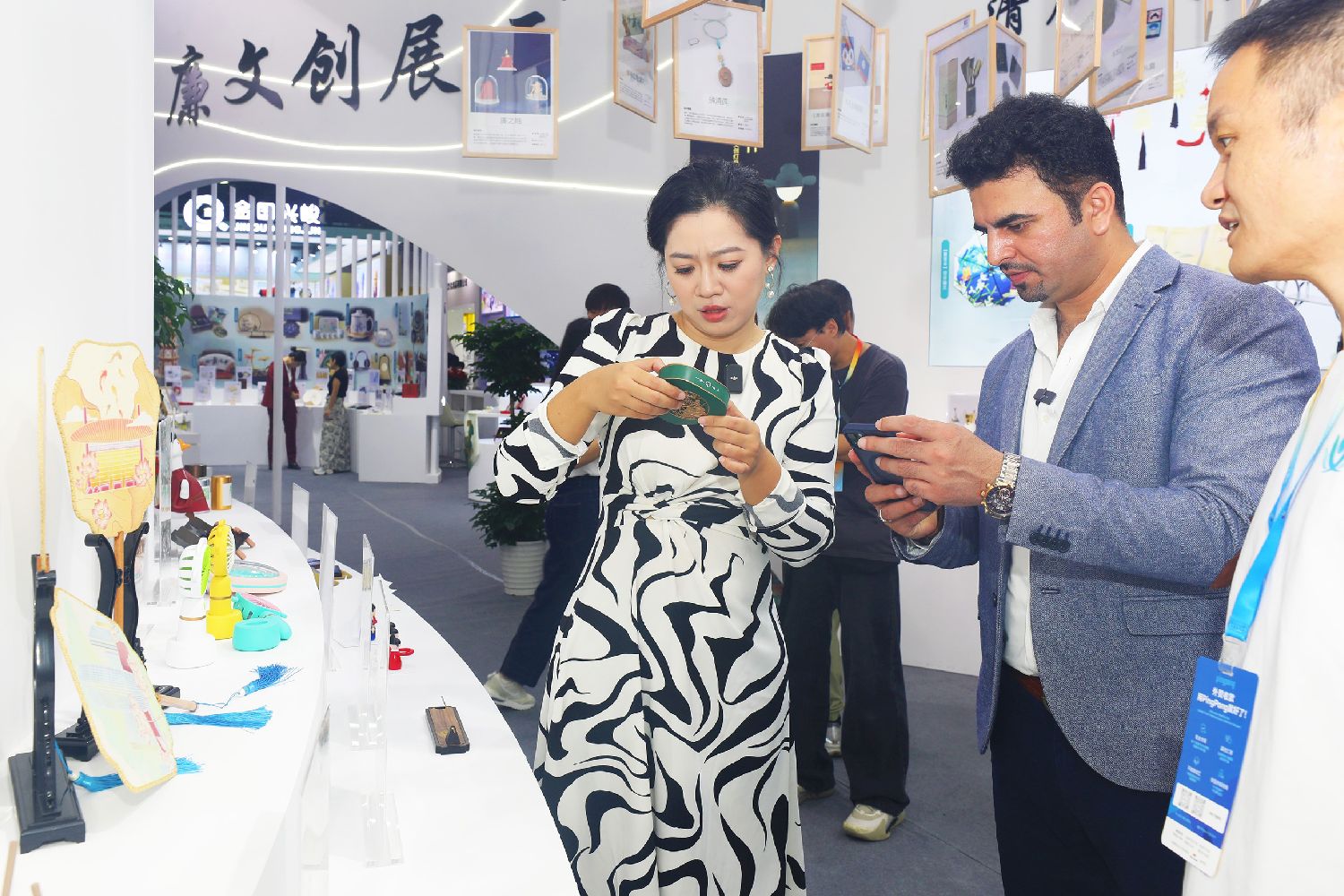 图为10月21日,浙江金华,第30届中国义乌国际小商品博览会现场,采购商在了解以清廉为主题的文创产品。(CFP)