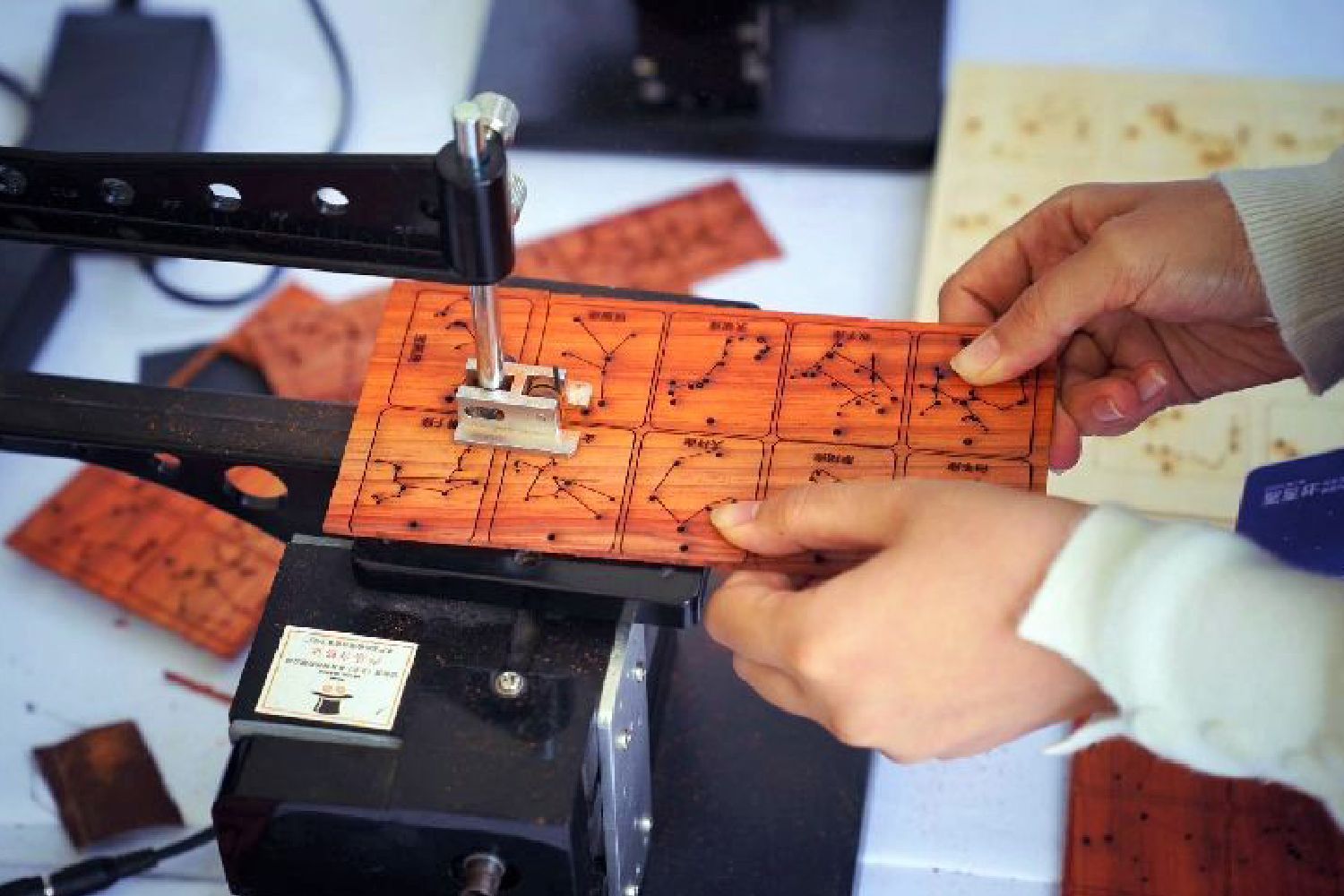 图为10月22日,北京,2024第三届聚星杯天文文创设计大赛现场,一位来宾亲手制作木质手工星座牌。(北京《新京报》)