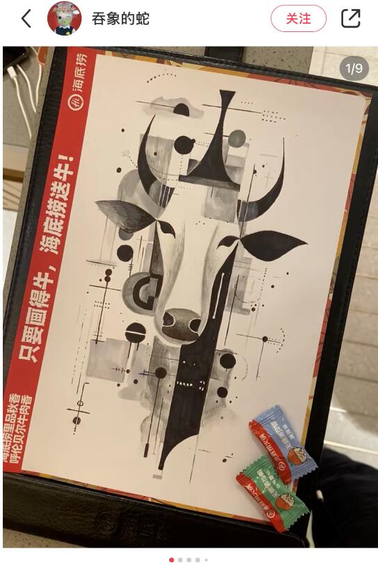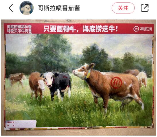 中国社交媒体小红书上#海底捞画牛#的话题阅读量已经超过了2347万。其中最高的一条,是一群“央美的同学在海底捞聚餐”的内容。视频中显示,当时一群中央美院的同学去到海底捞聚餐。包括油画系、壁画系、绘画美食博主、修复学院各种艺术行业的从业者看到了这则活动后,开始“八仙过海各显神通”。有人掏出了彩铅,有人拿来了丙烯颜料,还有人用睫毛胶贴起了金箔……火锅店秒变“加班现场”。