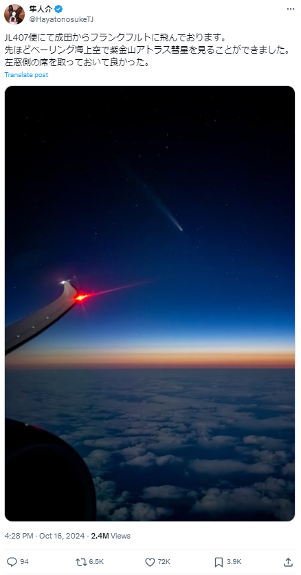 图为隼人介从飞机上拍摄的紫金山-阿特拉斯彗星。(图/隼人介社交平台X截图)
