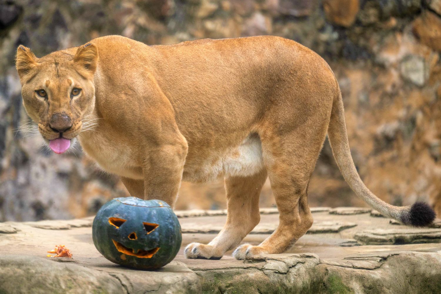 图为10月30日,哥伦比亚卡利动物园,狮子与万圣节装饰物同框。(CFP)
