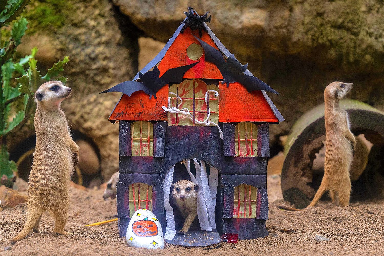 图为10月30日,哥伦比亚卡利动物园,狐獴与万圣节装饰物同框。(CFP)