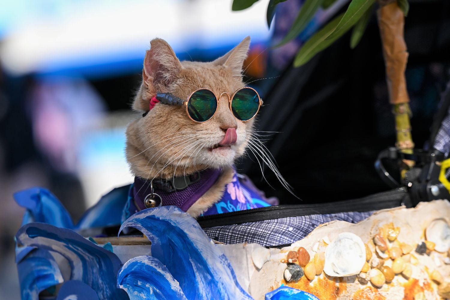 图为10月27日,美国加州森尼韦尔,万圣节前夕,一只猫穿着万圣节服装参加“森尼韦尔万圣宠物巡游”。(CFP)