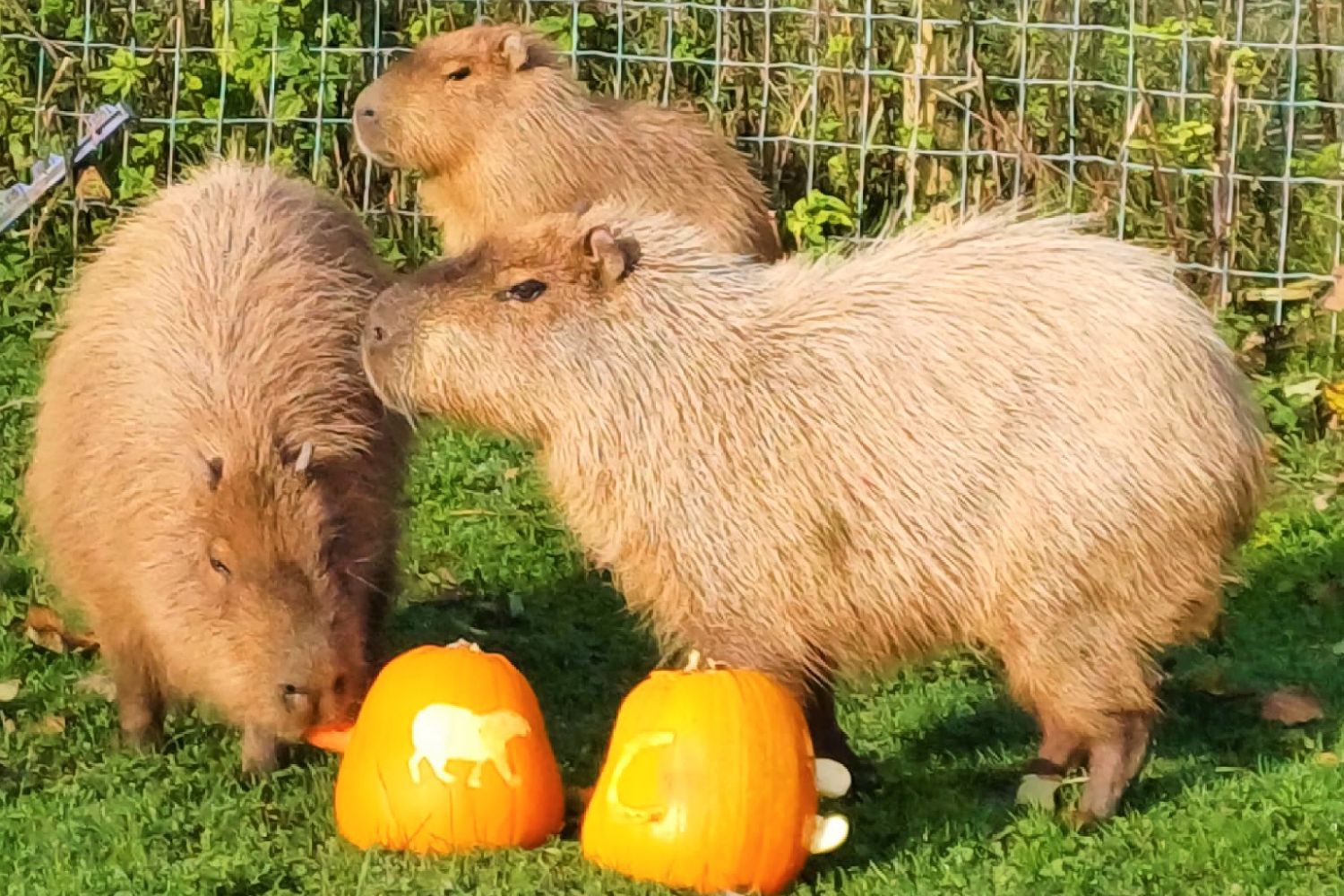 图为10月28日,英国什罗普郡,水豚肉桂和动物朋友们一直在享受万圣节主题的南瓜大餐。(CFP)