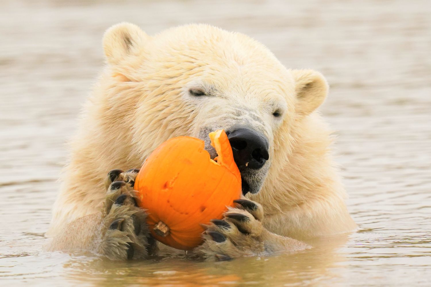 图为10月30日,英国,峰态野生动物园,北极熊纳努克和诺里享用万圣节南瓜美食。(CFP)