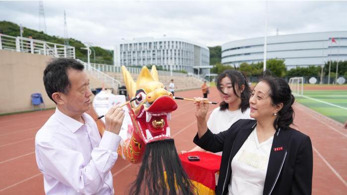 福建省侨联党组书记、主席陈式海(左)和华侨大学副校长王丽霞共同为龙舟点睛。(图/中新网)