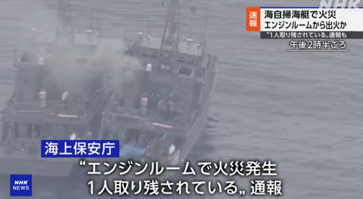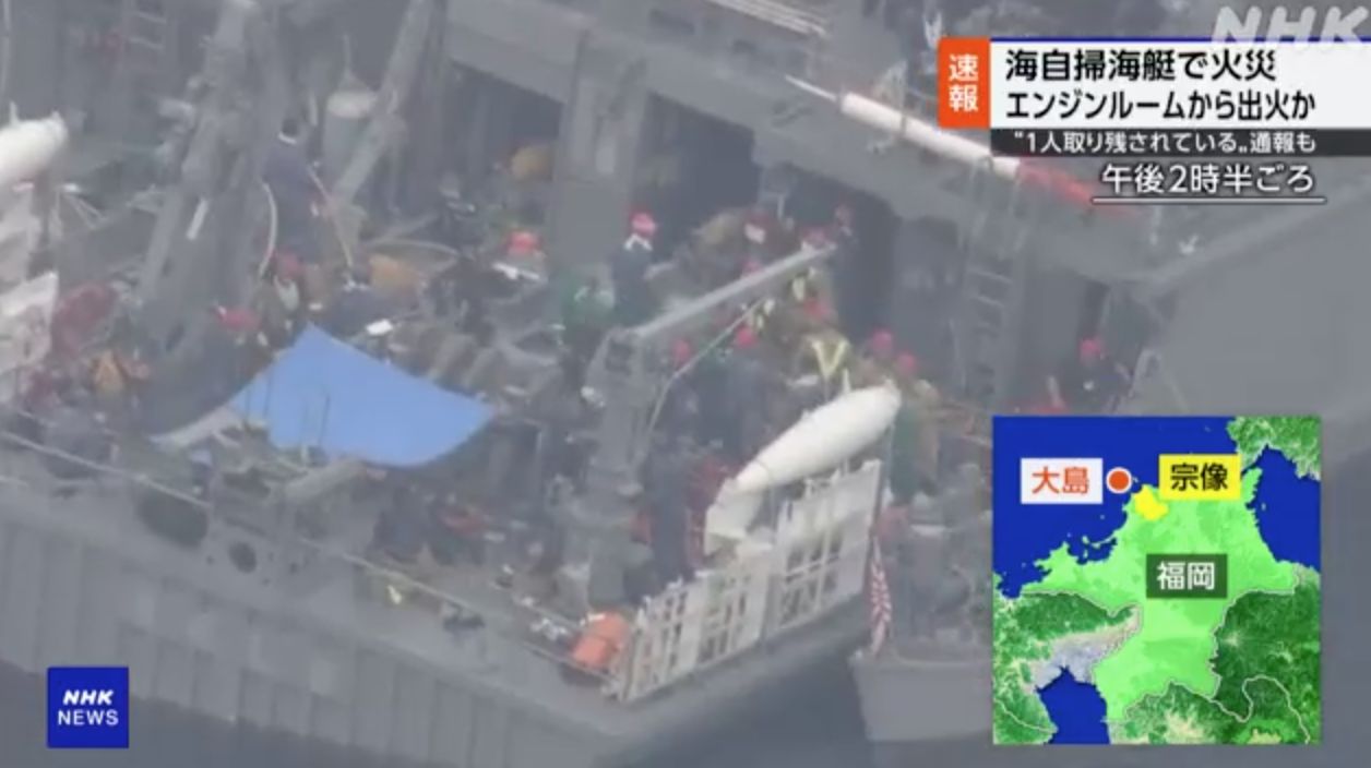 (亚太快讯消息)据NHK报道据海上自卫队等消息10日上午,在福冈县近海航行的海上自卫队扫雷艇发生火灾,1人被运送。据海上保安厅透露,有报告称发动机室中有一人被留下,自卫队和海上保安部在进行灭火活动的同时正在进行确认。据海上自卫队消息,10日上午9点40分左右,在福冈县宗像市大岛北约2公里海域航行的扫雷艇“海岛”起火。