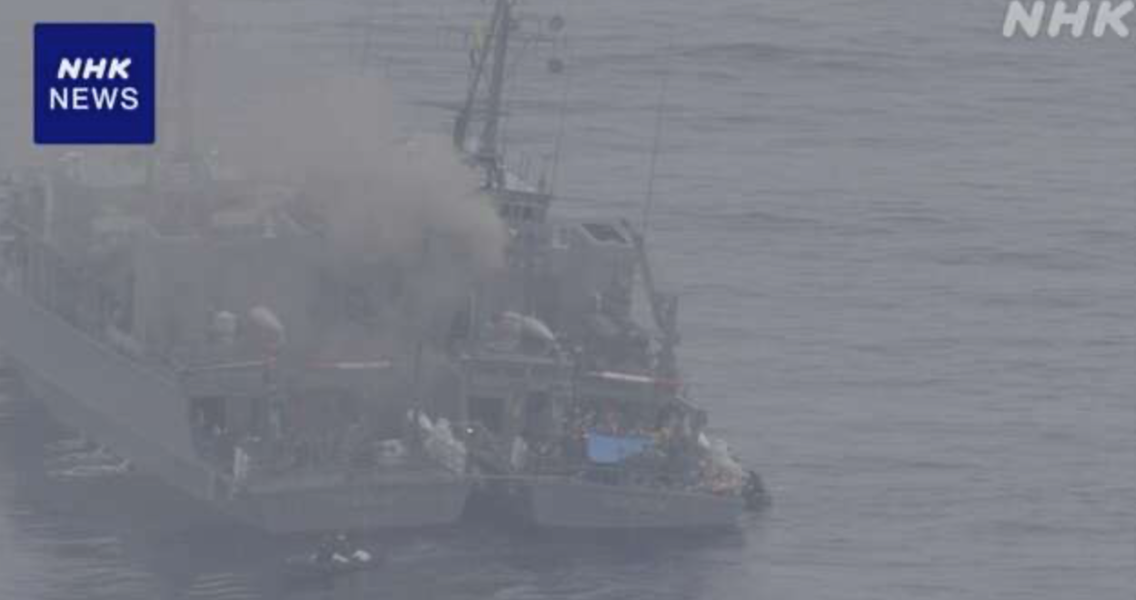 下午2点20分左右,NHK的直升机从上空拍摄的影像中,有2艘在海上横着的状态。其中,右侧是“海岛”,船后部的两条烟囱的一边冒着灰色的烟。可以看到很多自卫队员乘坐“海岛”确认情况的样子。根据海上自卫队的主页,扫雷艇全长54米,宽9.4米,基准排水量510吨。