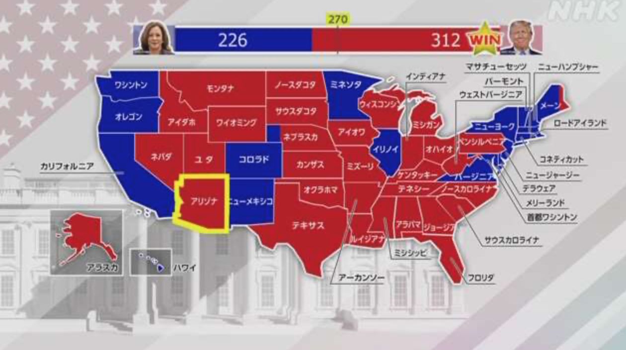 根据这一结果,特朗普获得了超过270名全美选举人的312名选举人,与226名民主党副总统哈里斯拉开了很大差距。另外,据美联社报道,截至日本时间上午11点半,全美的总得票数为,特朗普为7464.43万票,哈里斯为7091.573万票。