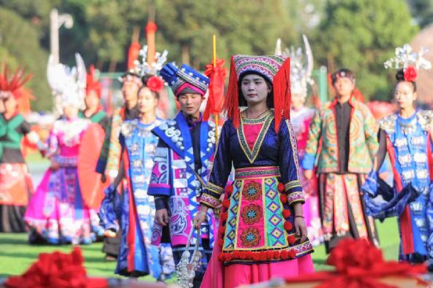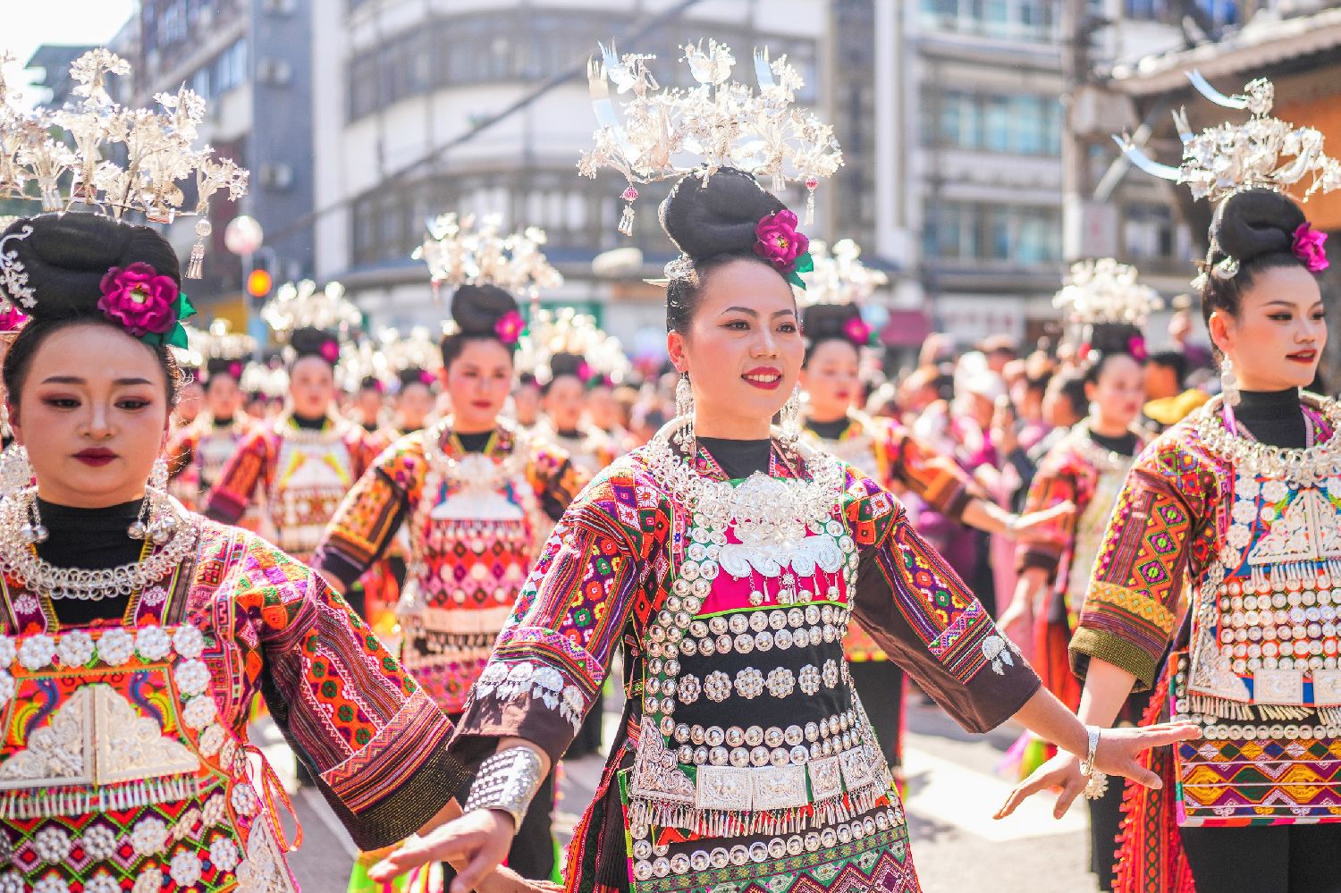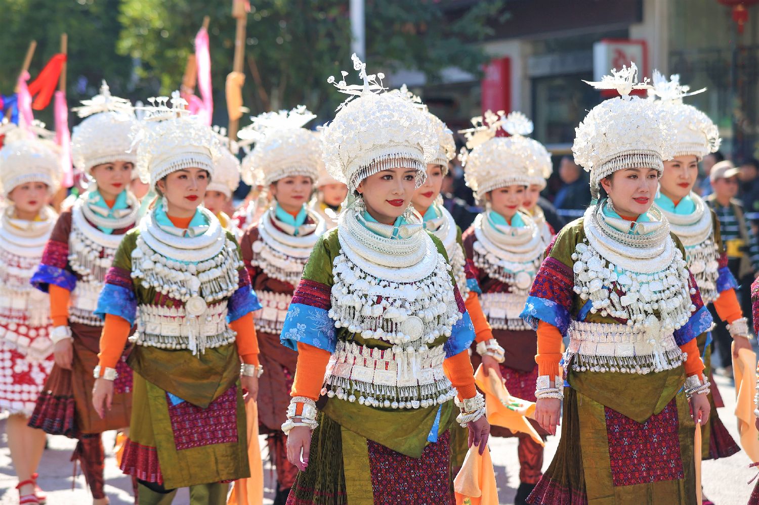 图为11月10日,身着盛装的苗族同胞参加巡游活动。(新华社)
