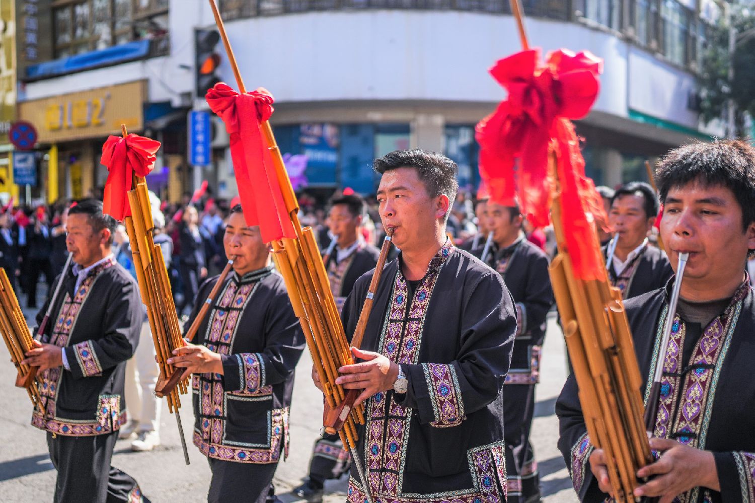 图为11月10日,参加巡游活动的苗族同胞在吹奏芦笙。(新华社)
