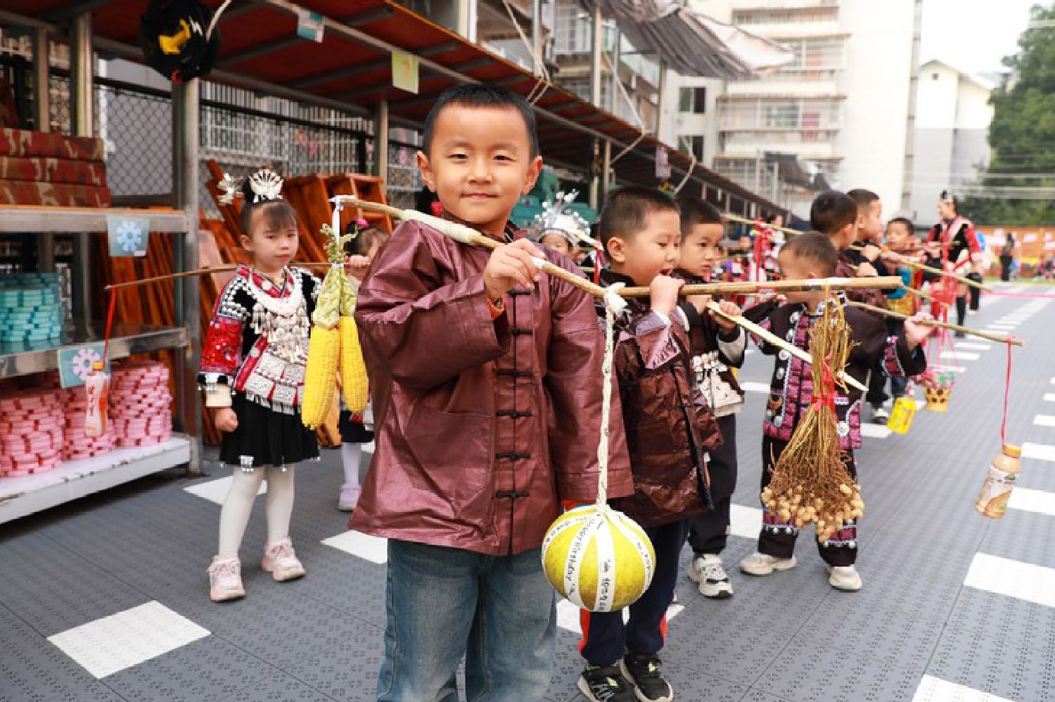 图为11月6日,剑河县城关第四幼儿园,小朋友们挑着年礼游行展示。(央广网)
