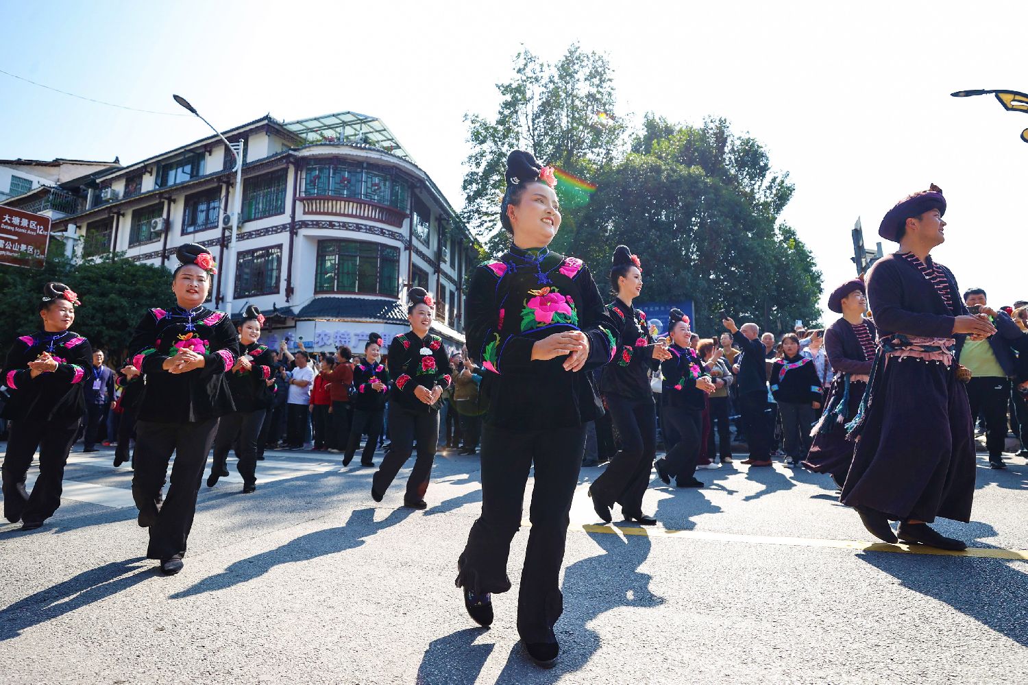 图为11月10日,苗族民众在巡游中跳舞。(中新社)