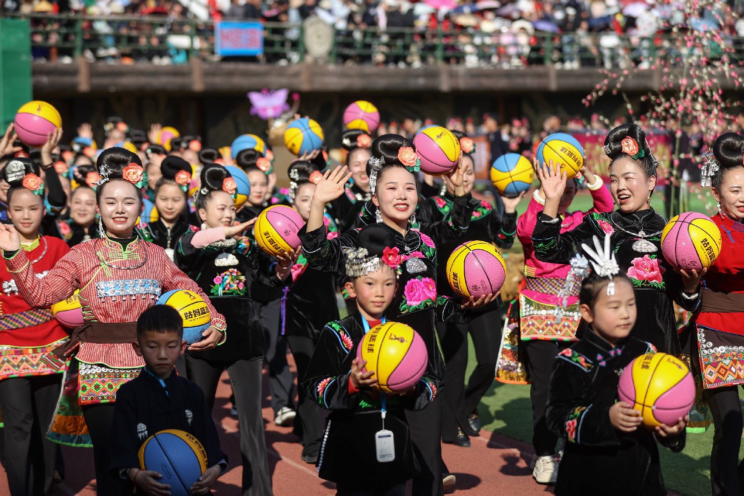 图为11月10日,雷山“姑妈篮球”代表队参加巡游。(中新社)
