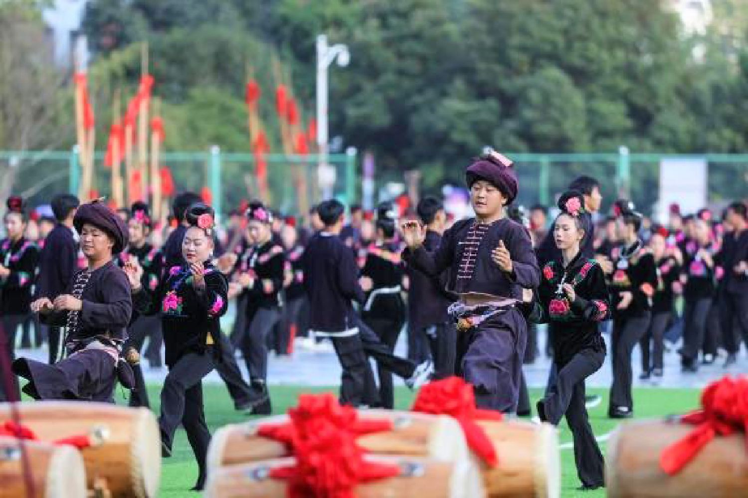 11月10日,2024中国·雷山苗年暨鼓藏节开幕,“盛世苗年·神韵鼓藏”大型民族歌舞展演在贵州省雷山县铜鼓广场举行,图为第一篇章《鼓藏神韵》演出。 (中新社)