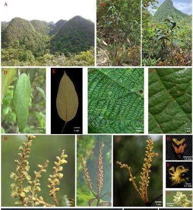 论文第一作者、贵州大学生命科学学院博士研究生余江洪介绍,经开展形态学和分子系统学研究后证实,并派研究生前往江西赣州采集近缘种网脉粗糠柴花果标本、分子样进一步核对,确认该树种为与网脉粗糠柴近缘的新种,并正式命名为“荔波野桐”。该树木新种为常绿灌木或小乔木,以叶革质,叶面极度皱缩为特征,仅分布于保护区岩石裸露率95%以上的喀斯特森林中。