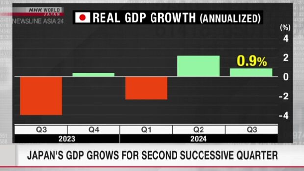 日本内阁府11月15日公布了今年7至9月第三季度的国内生产总值、GDP的快报数据。剔除物价变动因素的实际GDP换算成年率增长0.9%,连续两个季度实现增长。