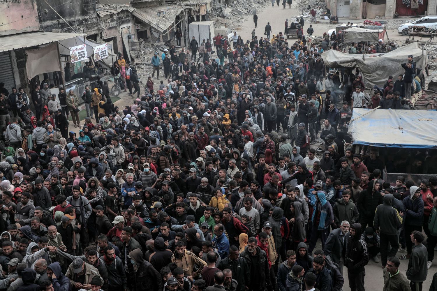 图为11月18日,在加沙地带南部城市汗尤尼斯,巴勒斯坦人排队等待购买食物。(图/新华社)
