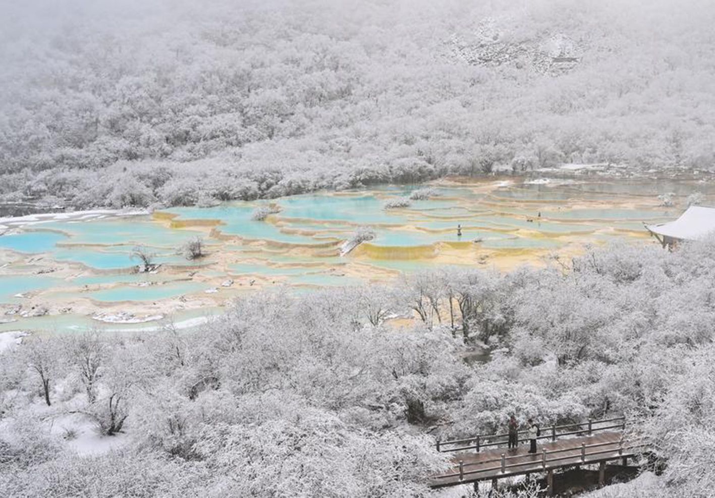 游客在四川省阿坝藏族羌族自治州黄龙景区五彩池观光,雪后的四川省阿坝藏族羌族自治州黄龙景区薄雾弥漫,仿佛披上了一层轻纱,如梦如幻。(新华社)