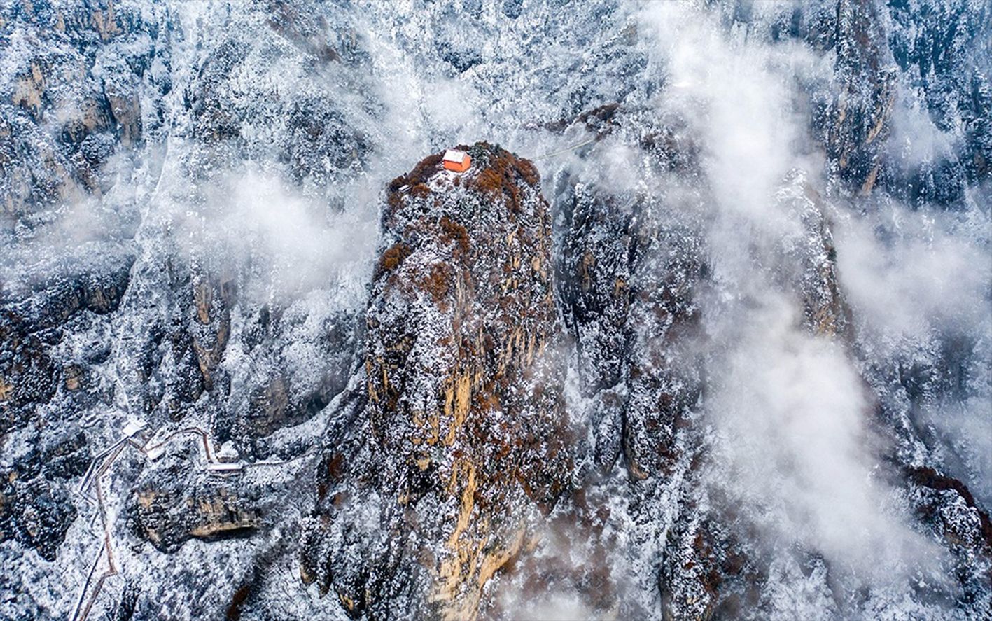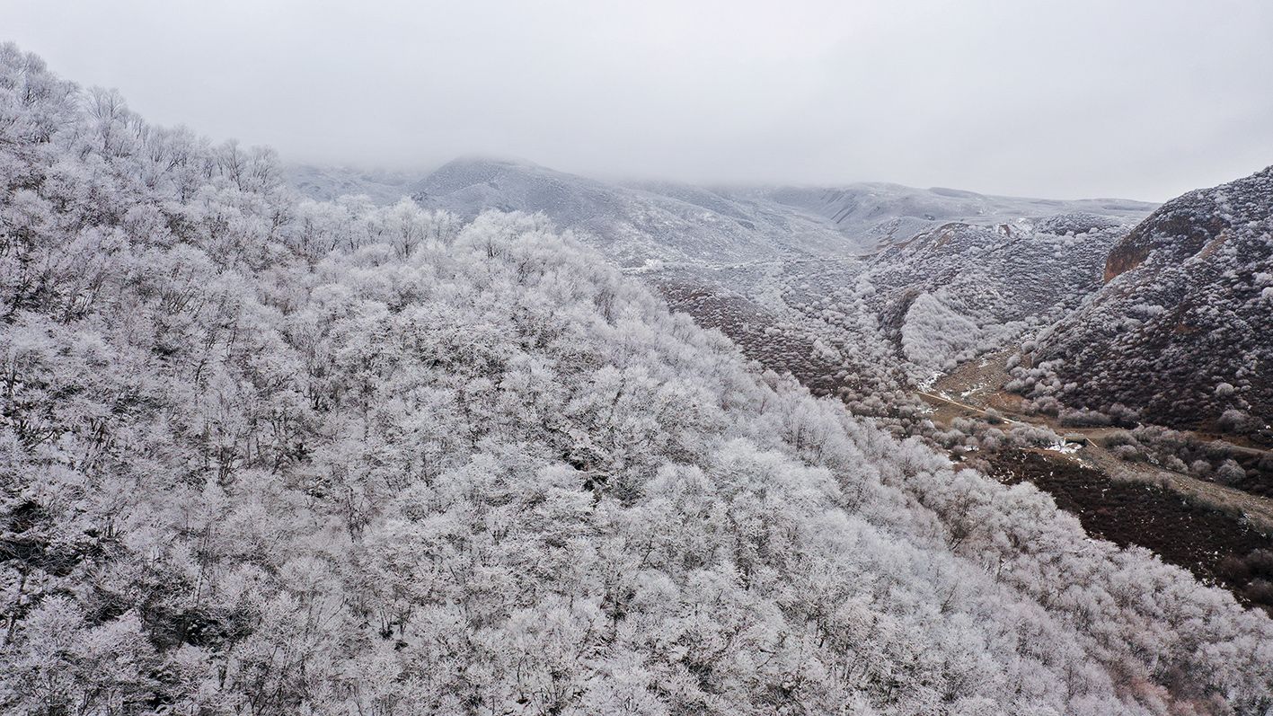 11月19日,航拍甘肃省陇南市宕昌县官鹅沟景区初冬雪雾奇观。11月17日至19日,“相约官鹅·畅游宕昌”冬春季旅游踩线活动在当地举行。来自甘肃、青海、四川、陕西、重庆、宁夏、内蒙古等地旅游协会和千家旅行社代表及各大媒体记者、旅游博主、旅游行业从业投资者等参加了旅游踩线活动。(中新社)