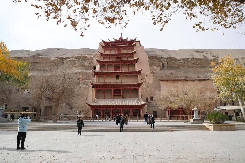 11月14日,游客在莫高窟标志性建筑九层楼前拍照留念。(图/新华社)