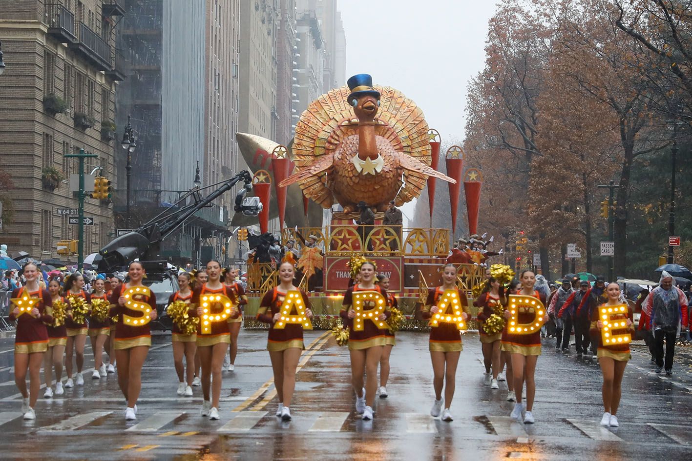 当地时间11月28日,第98届梅西百货感恩节大游行在美国纽约雨中举行。图为“火鸡汤姆”巨型花车方阵。(中新社)