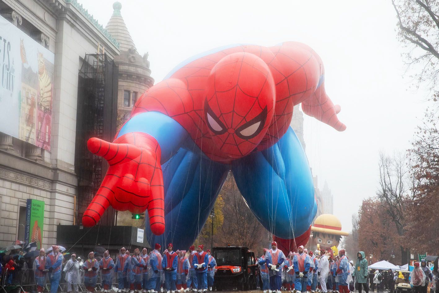 当地时间11月28日,第98届梅西百货感恩节大游行在美国纽约雨中举行。图为全新亮相的蜘蛛侠巨型气球。(中新社)