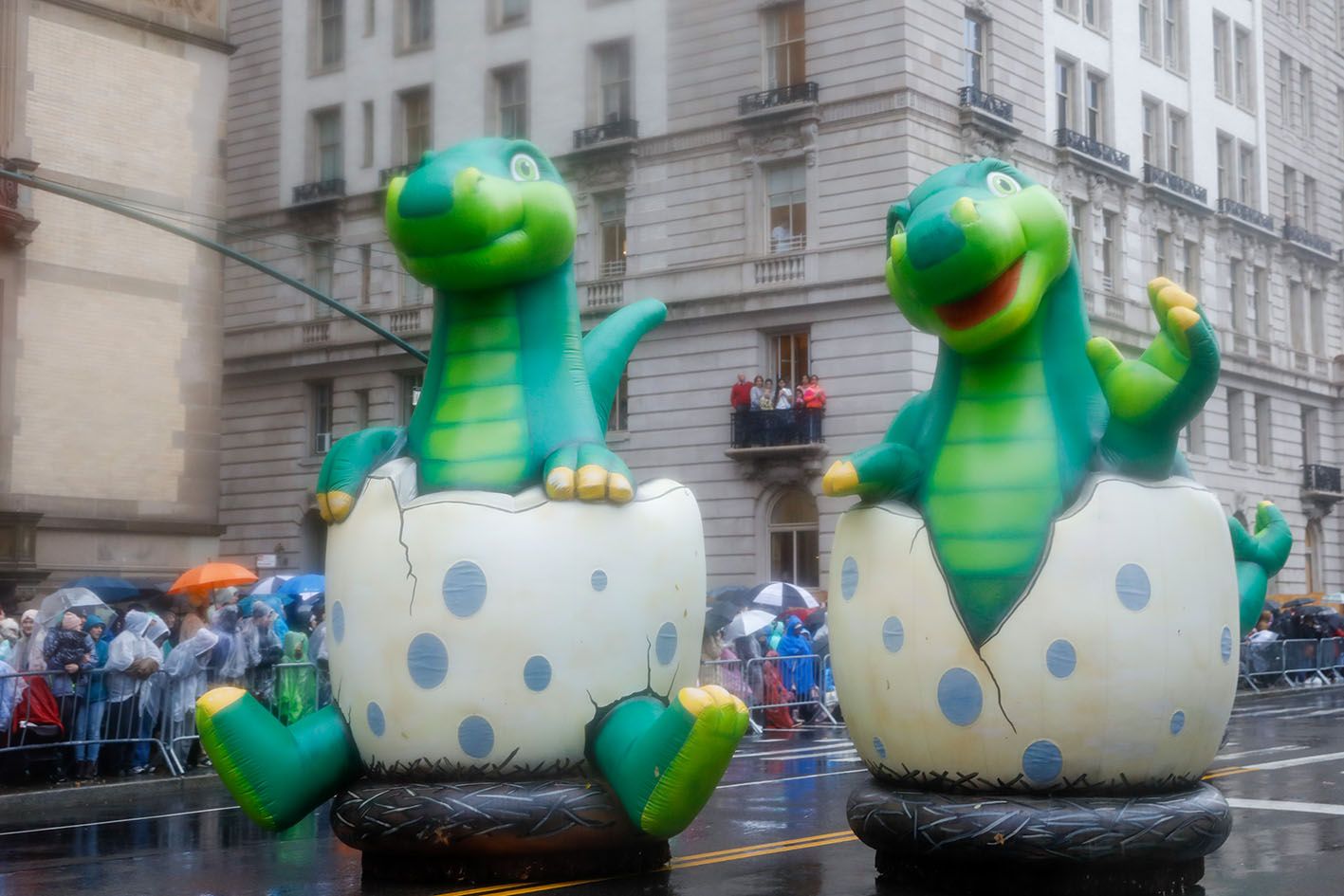 当地时间11月28日,第98届梅西百货感恩节大游行在美国纽约雨中举行。图为队伍中的恐龙宝宝充气玩偶。(中新社)