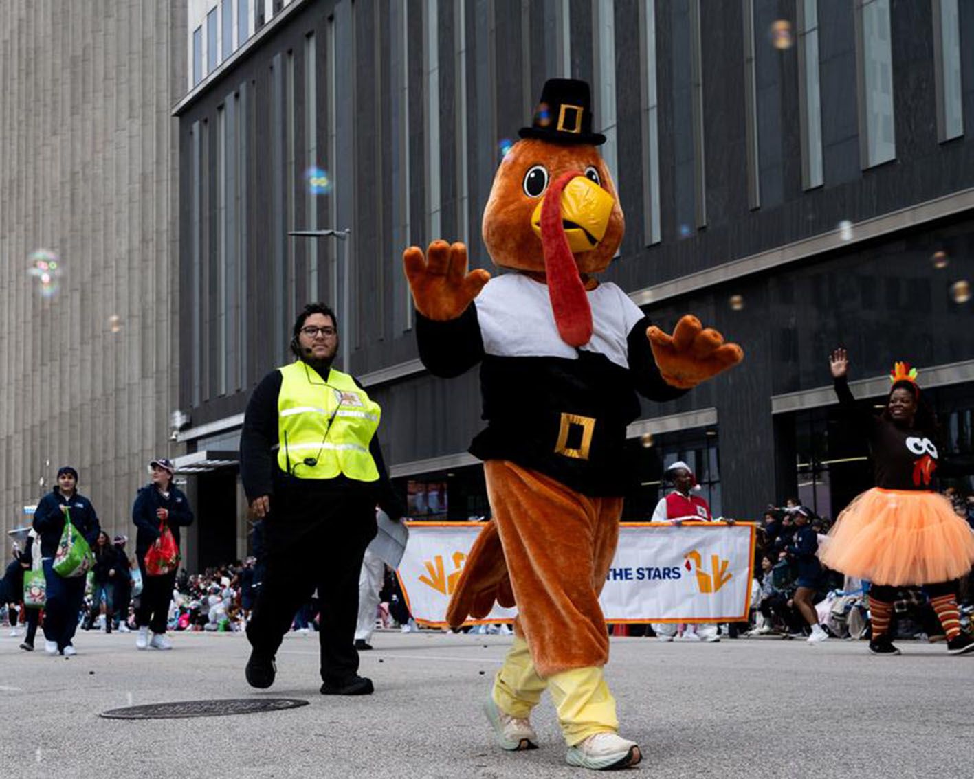 11月28日,身穿玩偶服装的表演者在美国休斯敦参加感恩节游行。(新华社)