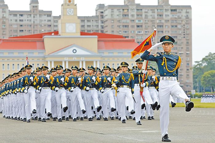 图为台湾陆军官校(黄埔军校在台复校后名称)举办百年校庆活动,学生连踢正步预演。(图/台北中时新闻网)