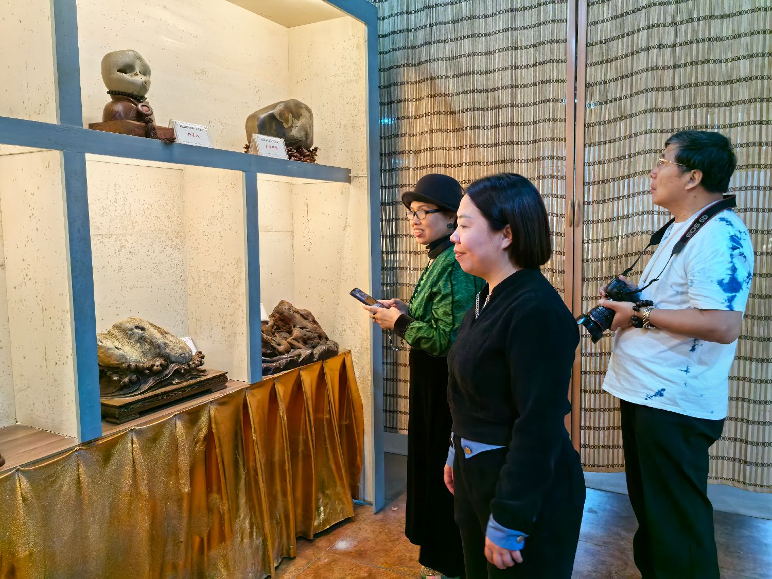 千奇百怪、形态各异的藏品每年吸引众多游客前往参观。图为海外华文媒体代表拍照留念。(万鲤 摄)