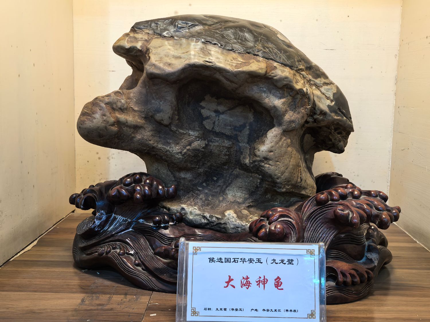 2000年5月,华安县还被中国官方命名为“中国民间玉雕艺术之乡”。华安玉奇石集形、质、韵、色为一体,既是石玩之珍品,又是园林置石之佳作。图为博物馆内陈设藏品“大海神龟”。(万鲤 摄)