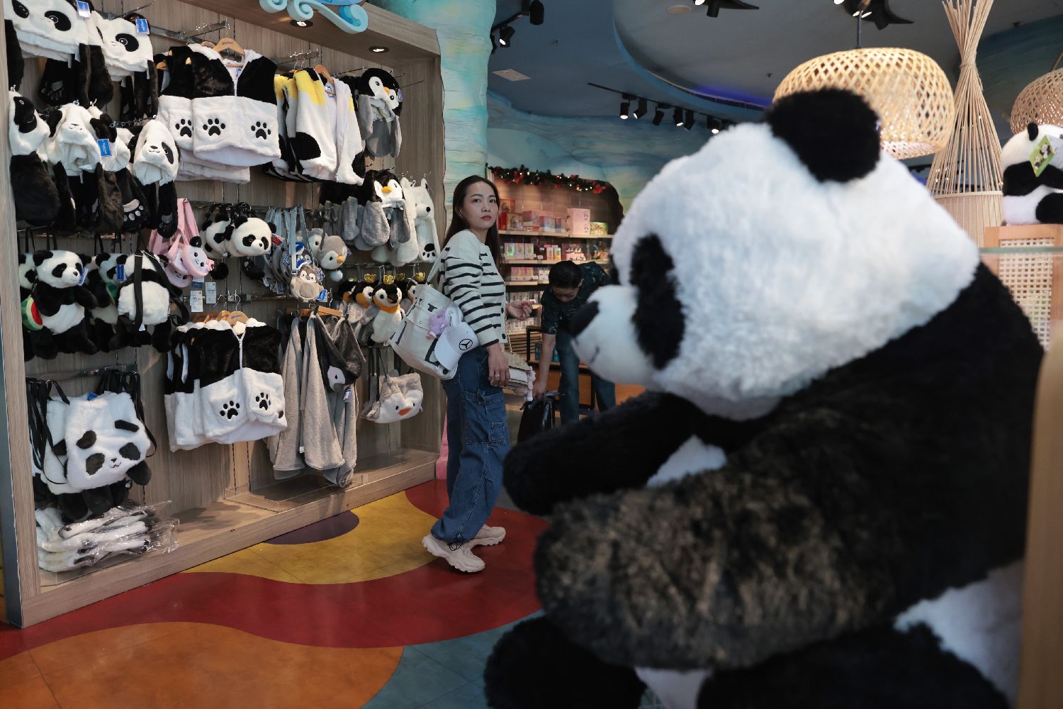 中央赠港大熊猫安安和可可将于8日开始在香港海洋公园跟公众见面,不少游客对此十分期待。图为近日,在海洋公园纪念品商店摆满各类大熊猫主题周边产品,吸引不少游客购买。(图/香港中通社)