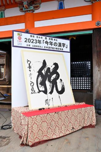 日本汉字能力检定协会2023年12月12日在京都清水寺公布,能够反映日本2023年世态民情的年度汉字为“税”。(图/新华社)