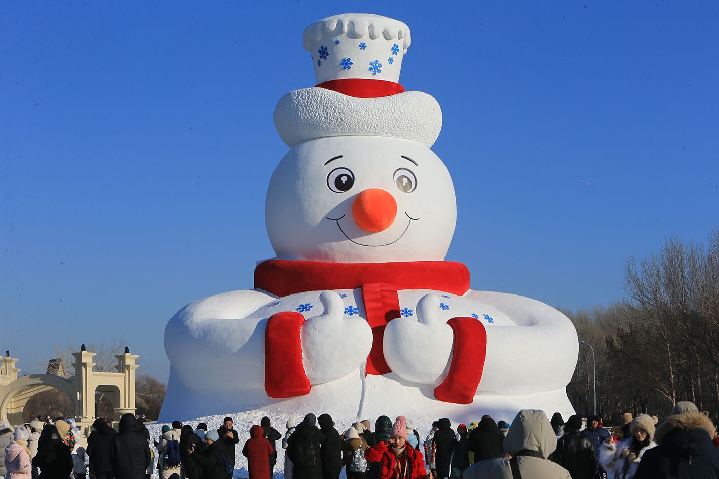12月8日,哈尔滨市今年冰雪季首个建成的大型雪雕——第37届太阳岛雪博会“雪人先生”亮相迎客。这座高达20米、用雪量达4000立方米的巨型雪雕,以标志性的雪花礼帽、红色围脖和可爱的面容,展现了雪雕艺术的热情与活力。此外,雪博会首批作品《悟空归来》和《传奇圣火》正在加紧雕刻中。图为雪博会首批作品“雪人先生”。(中新社)