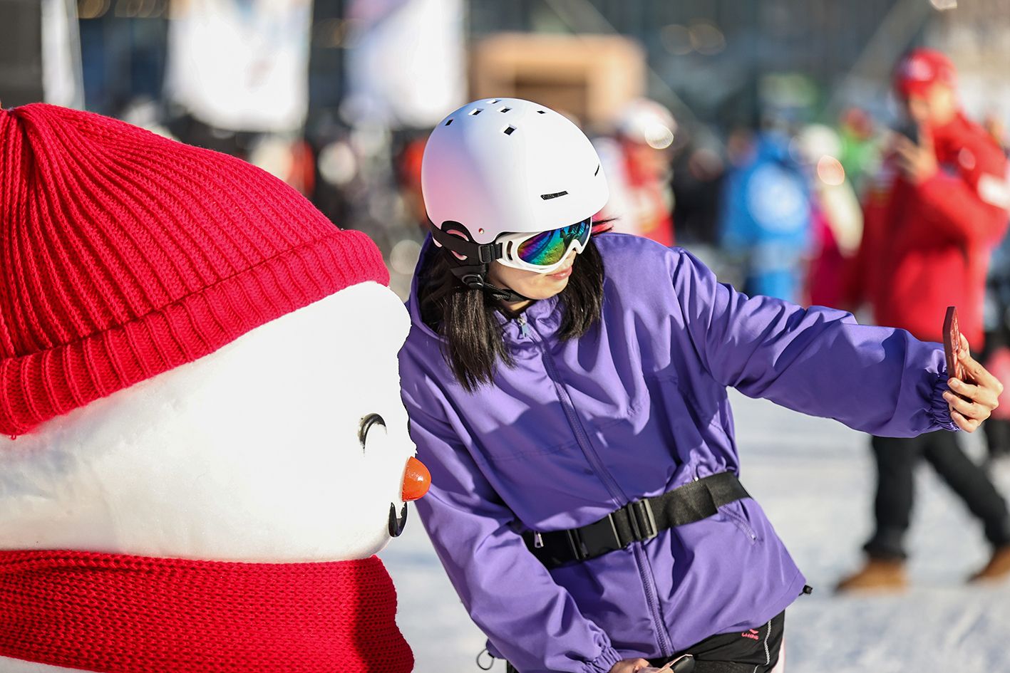 12月8日,2024-2025“冬日雪暖阳·撒欢儿在沈阳·身心齐欢畅”冰雪季开板仪式在沈阳举行。图为游客在滑雪场与雪人合影。(中新社)