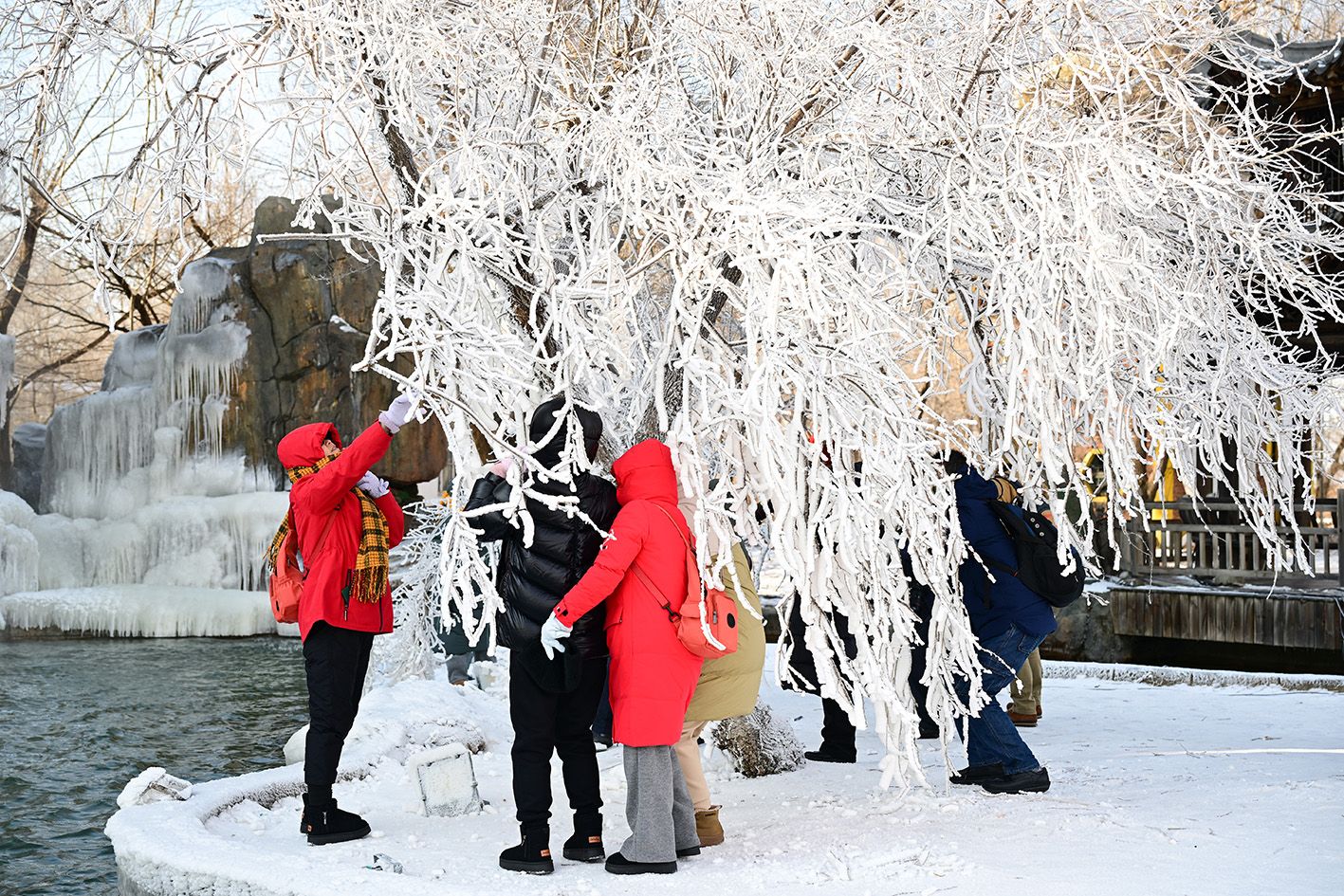 12月4日,吉林省吉林市,游客在雾凇岛观赏雾凇。随着吉林雾凇冰雪节的开幕,八方游客前往吉林市观赏雾凇、体验滑雪,带动吉林市冰雪经济逐步升温。(中新社)