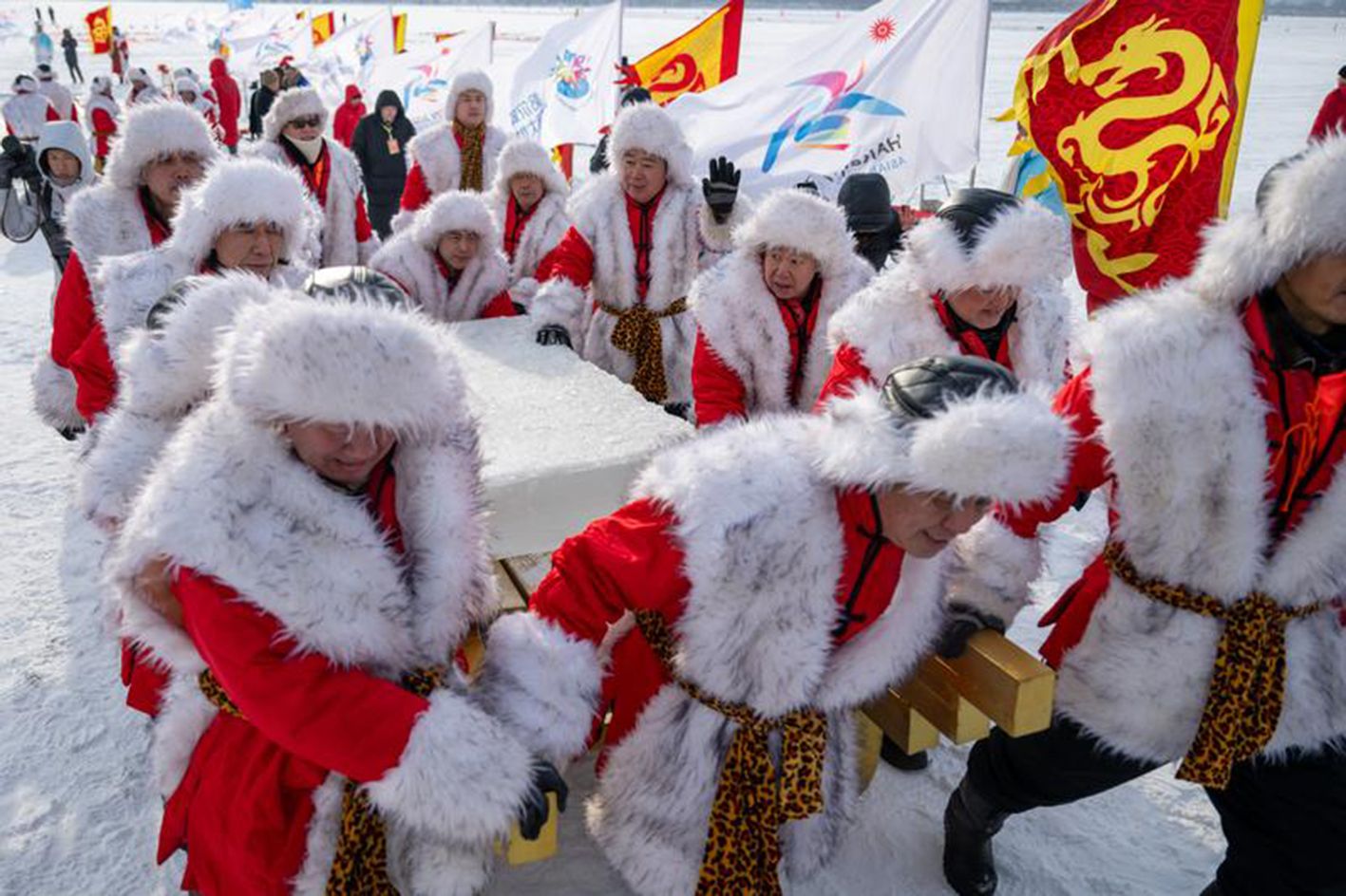 12月7日,在第五届哈尔滨采冰节现场,“采冰汉子”在运送头冰。当日,第五届哈尔滨采冰节在松花江畔开幕,标志着“冰城”哈尔滨进入了采冰季。今年的采冰节以“采头冰·庆亚冬”为主题,精彩的采冰仪式和表演吸引了众多市民和游客参与。(新华社)