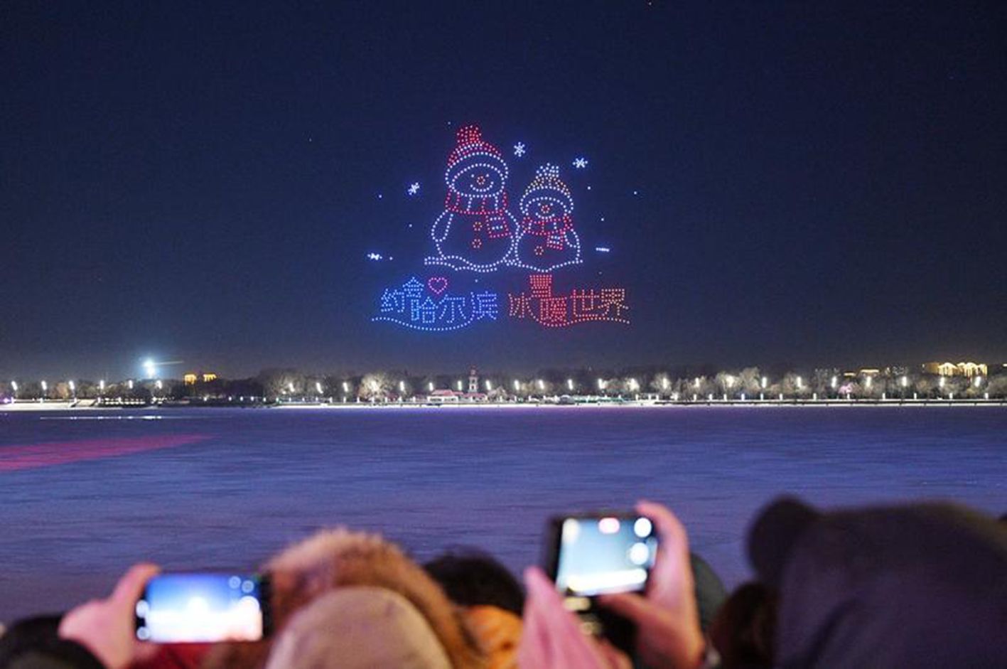 12月6日,人们在哈尔滨市人民防洪胜利纪念塔附近观看无人机光影秀。当晚,松花江哈尔滨段上空上演无人机光影秀,为即将到来的第五届哈尔滨采冰节和第二十六届哈尔滨冰雪大世界预热,吸引众多市民和游客前来观看。(新华社)