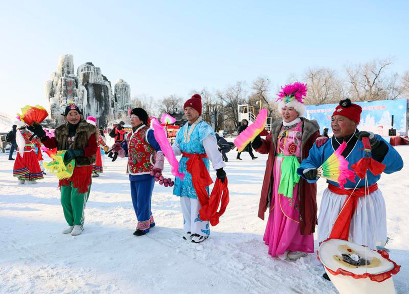 12月4日,参加嘉年华活动的当地群众表演东北秧歌。近日,吉林市龙潭区举行“雾凇冰雪嘉年华”系列活动暨雾凇岛赏凇盛典,展示龙潭区独特的冰雪资源和文化魅力,为广大游客带来更为多元、更具特色的旅游体验。(新华社)