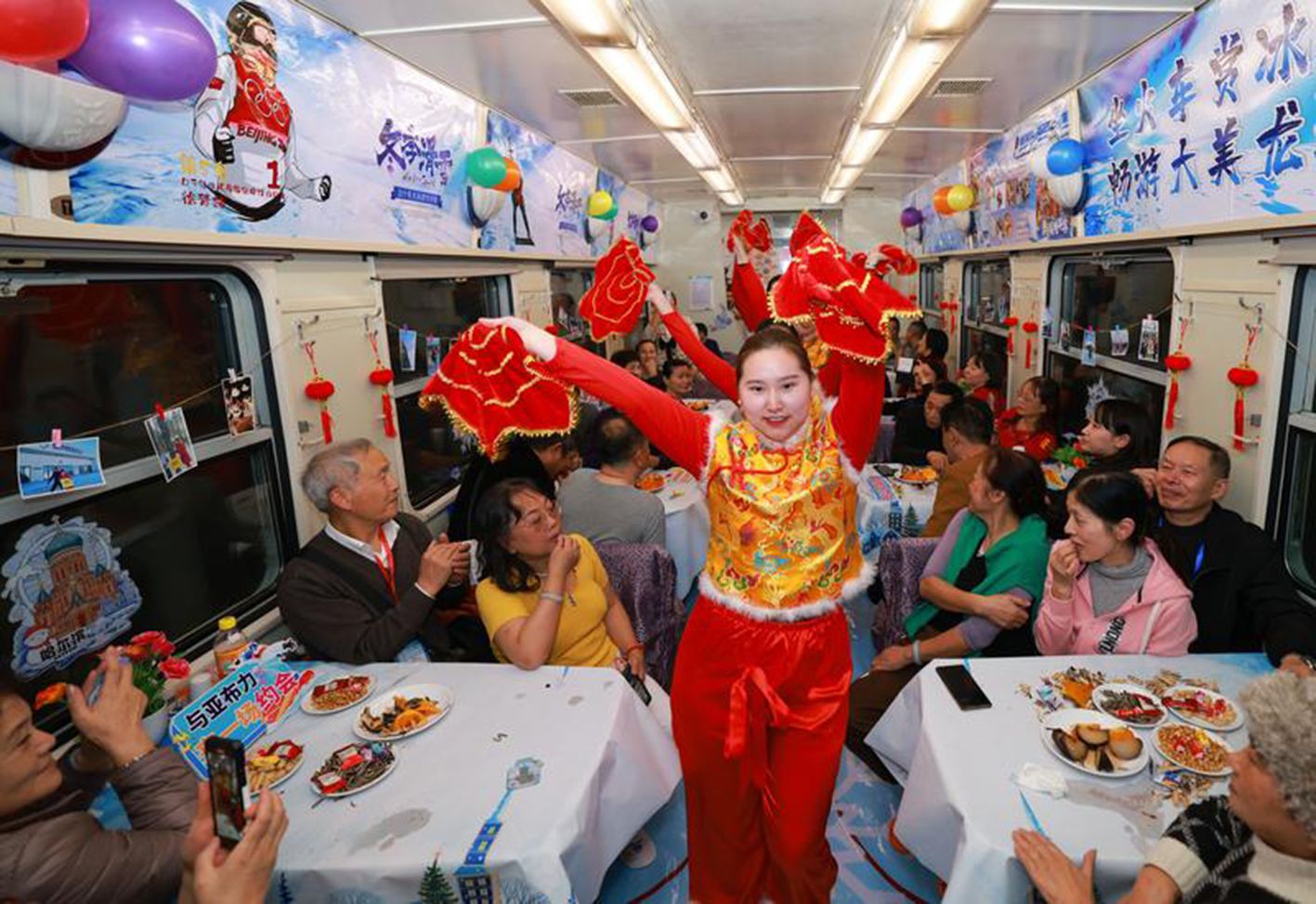 近日,252名60岁以上的老年旅客乘坐Y685次“福鹿雪国号”号旅游列车从哈尔滨东站出发,开启为期7天的畅游冰雪之旅。列车乘务人员将餐车以冰雪为主题进行装饰,并准备了歌舞文艺节目,为“银发族”旅客提供舒适温馨之旅。图为列车乘务人员为旅客表演大秧歌。(新华社)