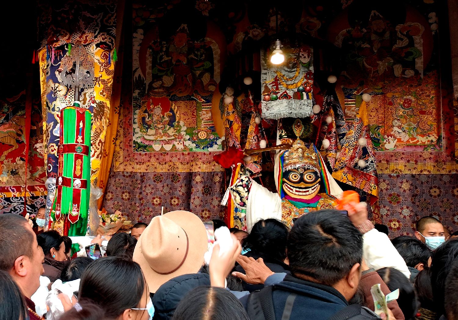 当日,来朝拜的信众队伍井然有序,许多信众着节日盛装,将装束好的鲜花、哈达以及青稞酒供奉给白拉姆,大昭寺院中央则设置了一个大型酒壶,不少人将自带的青稞酒倒入,随即从酒壶底部取饮,他们认为这是女神加持过的“福酒”,会为他们带来幸福和吉祥。