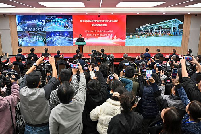 2024年3月1日零时,横琴粤澳深度合作区正式封关运行。图为合作区封关运行启动仪式。(图/ 中新社)