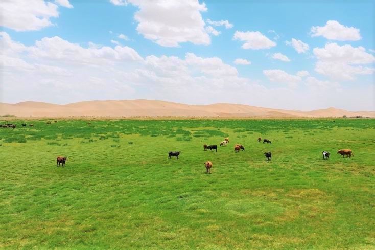 图为内蒙古自治区阿拉善盟阿拉善右旗境内巴丹吉林沙漠边缘的荒草湖,随着生态治理,这里从荒漠变为了绿洲,牛群在巴丹吉林沙漠附近绿洲悠闲地吃草。(中新社)
