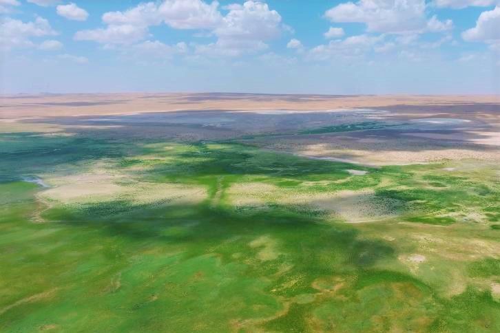 图为内蒙古自治区阿拉善盟阿拉善右旗境内巴丹吉林沙漠边缘的荒草湖,数十平方公里内绿草茵茵,沙漠中蓝天、白云、绿草构成一幅美丽的生态画卷。(中新社)
