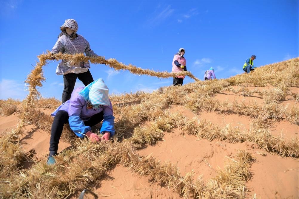 图为治沙工人在宁夏中卫市境内的腾格里沙漠铺设刷状网绳式草方格沙障。(新华社)
