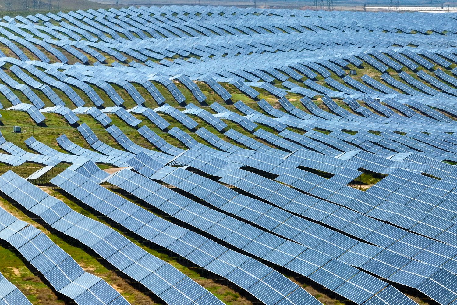 图为航拍银川市一处戈壁滩上的光伏基地,绿色能源与蓝天白云绿地形成了一幅美丽的生态画卷。(CFP)