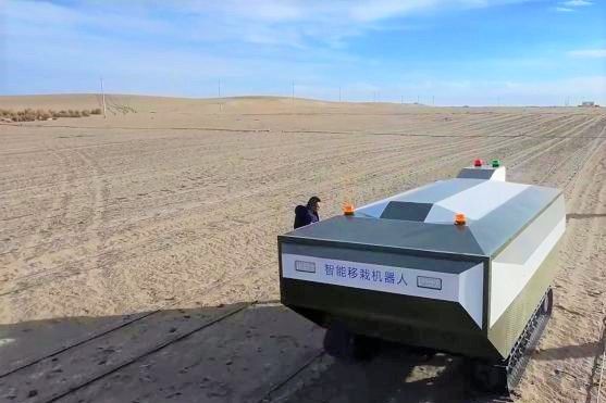 图为塔克拉玛干沙漠腹地的新疆且末县防风治沙工作站,一辆智能机器人正有条不紊地进行罗布麻种植作业。(中新社)