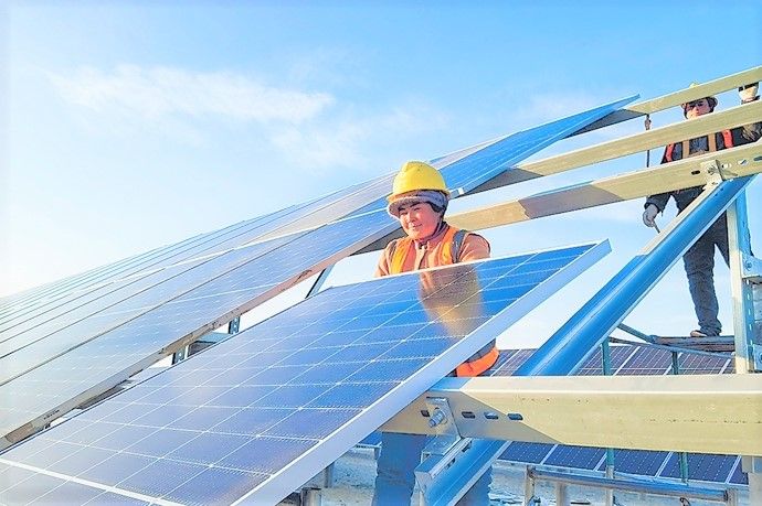 图为新疆和田市吉亚乡的华润新能源50万千瓦光伏治沙项目施工现场一派热火朝天景象工人在铺设光伏板。 (新疆天山网)