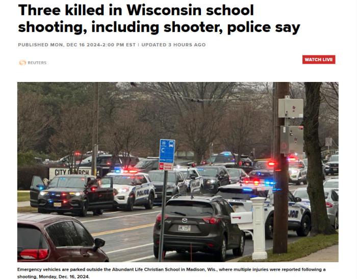 美国威斯康星州首府麦迪逊警方16日证实,该市发生的一起最新校园枪击事件已造成包括嫌疑人在内的3人死亡、6人受伤。(图/美国国消费者新闻与商业频道报道截图)
